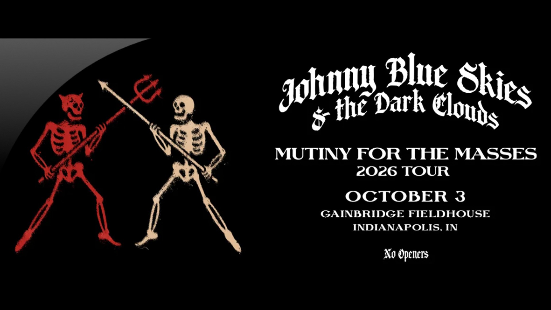 Johnny Blue Skies & the Dark Clouds have announced their return to the stage for a 2026 tour. Performing music from their new album, Mutiny After Midnight, the eagerly awaited Mutiny For The Masses Tour includes a stop in Indianapolis at Gainbridge Fieldhouse.